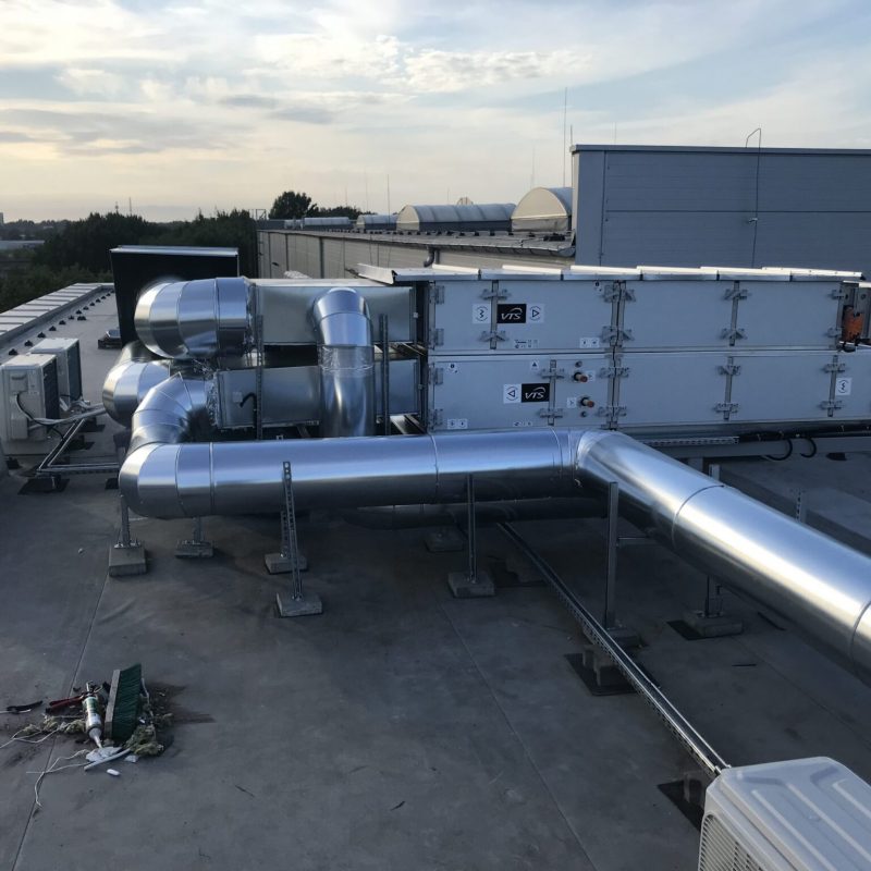 – wykonanie instalacji wentylacji mechanicznej w oparciu o centrale wentylacyjne nawiewno-wywiewne oraz wentylatory wyciągowe. Wentylacja obejmowała przestrzeń magazynową jak i pomieszczenia biurowe.