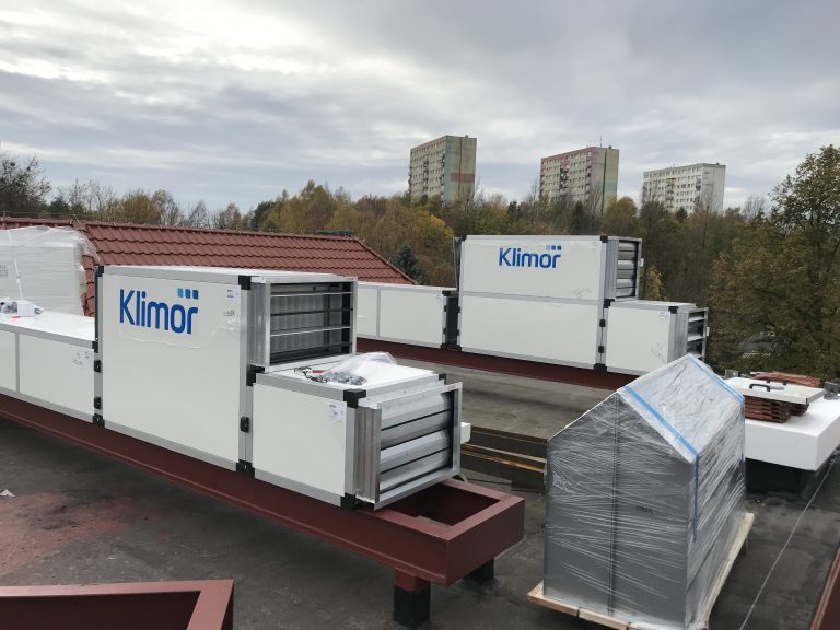 Jako źródło chłodu dla central wentylacyjnych zamontowano agregat wody lodowej o mocy chłodniczej 80kW.