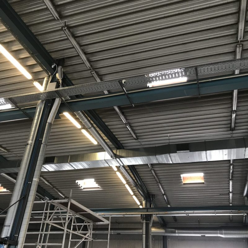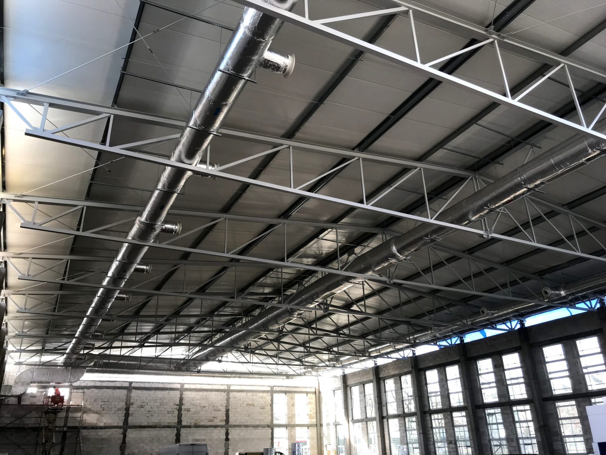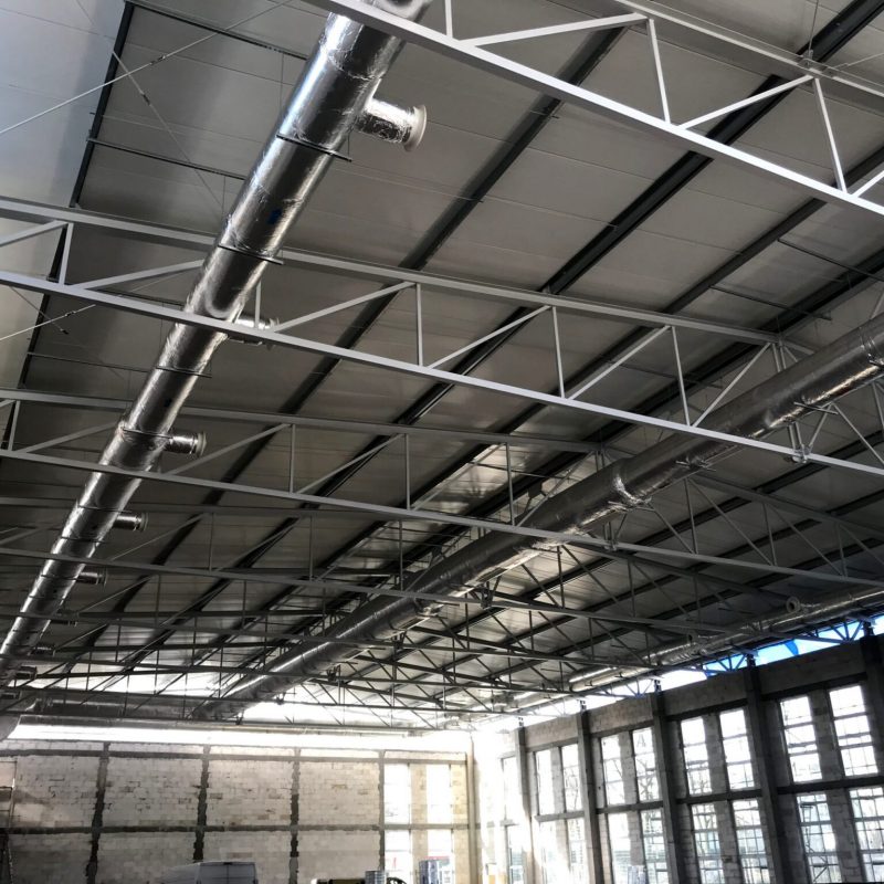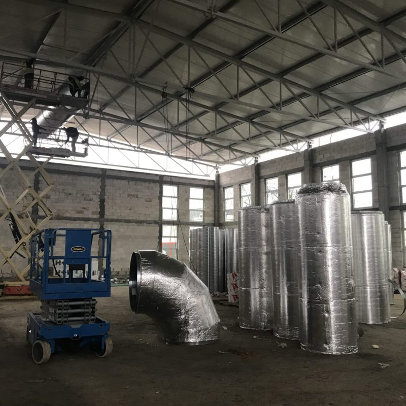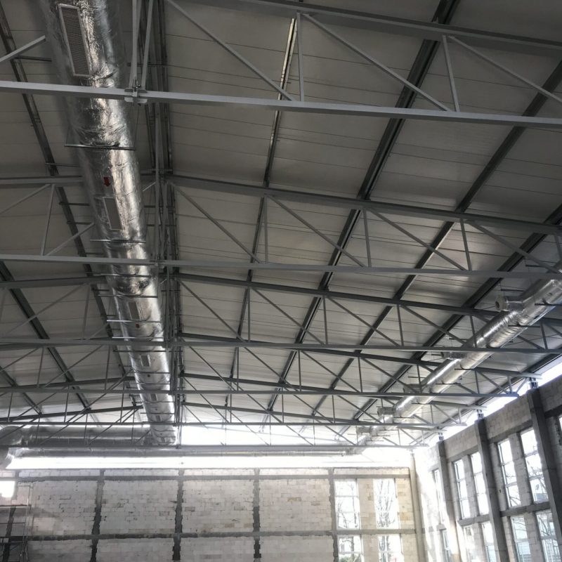 Zakres: Wykonanie instalacji wentylacji mechanicznej obsługującej salę gimnastyczną. Wydatek centrali obsługującej tą przestrzeń to 22 000 m3/h. Wykonano również wentylację pomieszczeń sanitarnych zaplecza Sali.